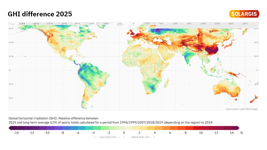 As every year, we bring you a map summarizing last year’s global horizontal irradiation (GHI) anomalies, highlighting how much regional weather conditions diverged from long-term averages (LTA). These maps help project developers, asset managers, and investors understand how atmospheric variability may have influenced PV performance worldwide.